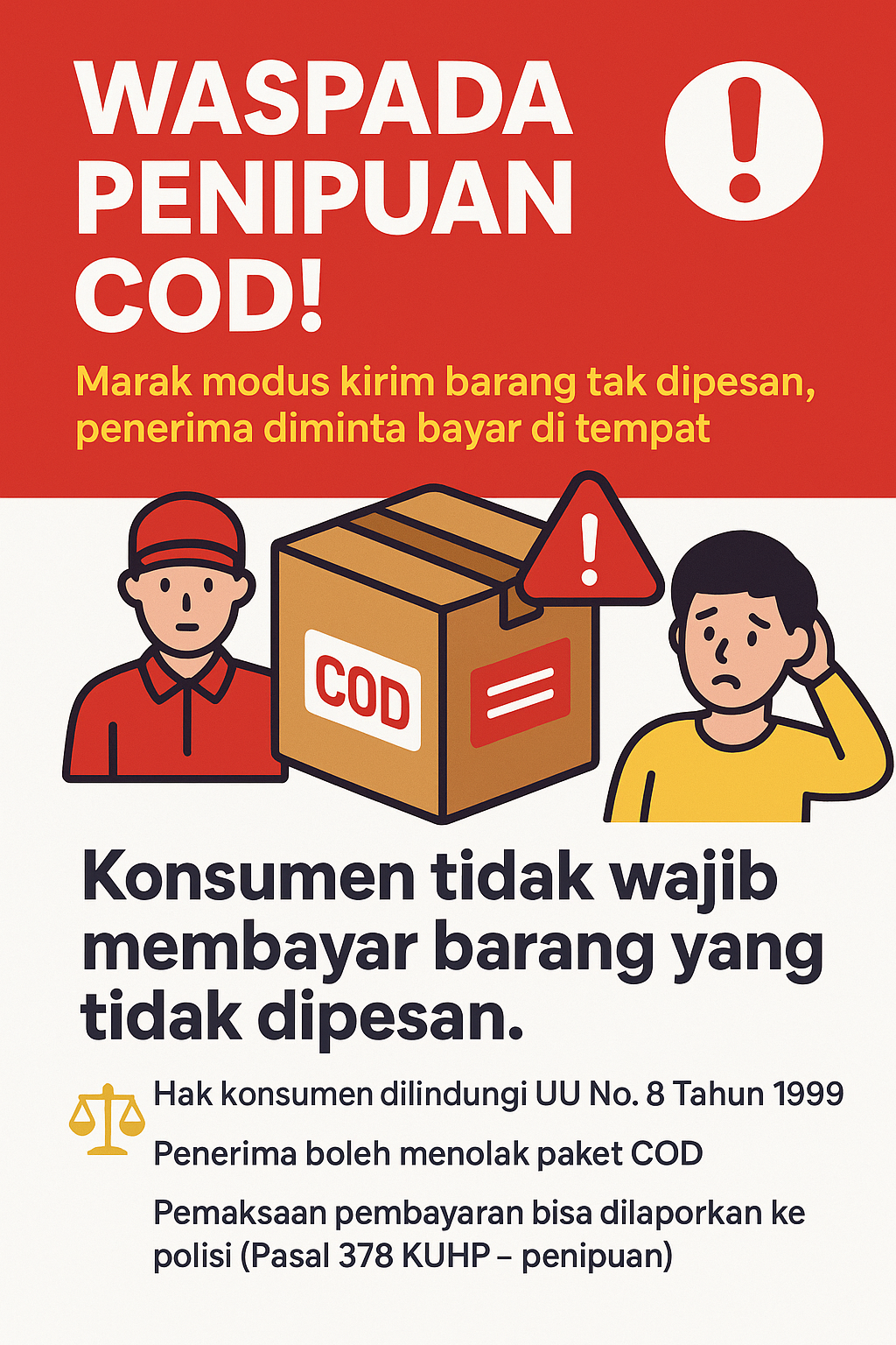 Ingat, Anda berhak menolak paket COD jika tidak merasa memesan. Perlindungan konsumen dijamin UU No. 8 Tahun 1999 dan pelaku bisa dijerat Pasal 378 KUHP.