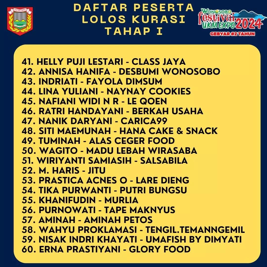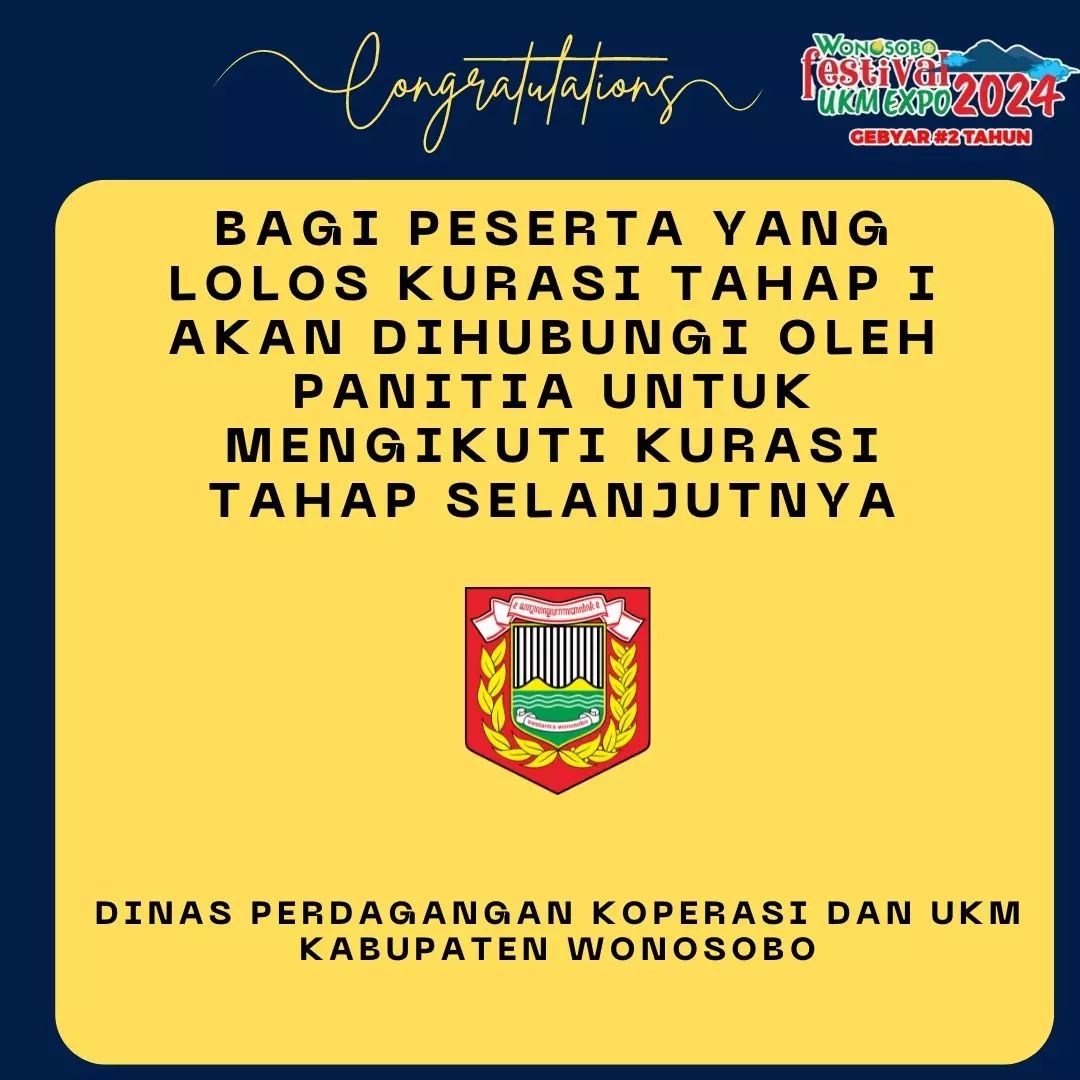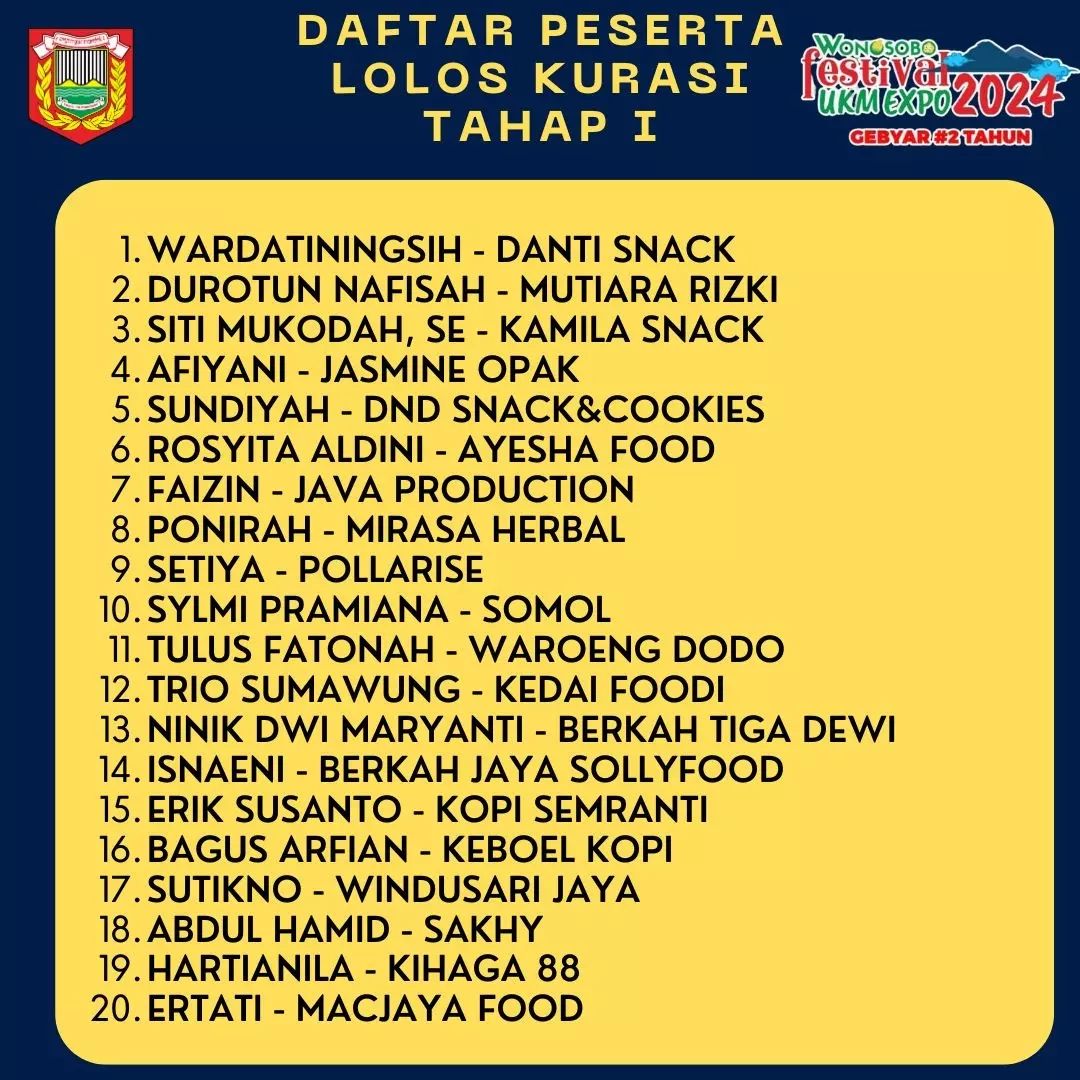 Berikut kami sampaikan daftar pelaku UKM yang lolos kurasi tahap 1 sebagai peserta "Wonosobo UKM Expo 2024". Bagi perserta yang dinyatakan lolos akan dihubungi oleh panitia untuk mengikuti kurasi tahap selanjutnya.