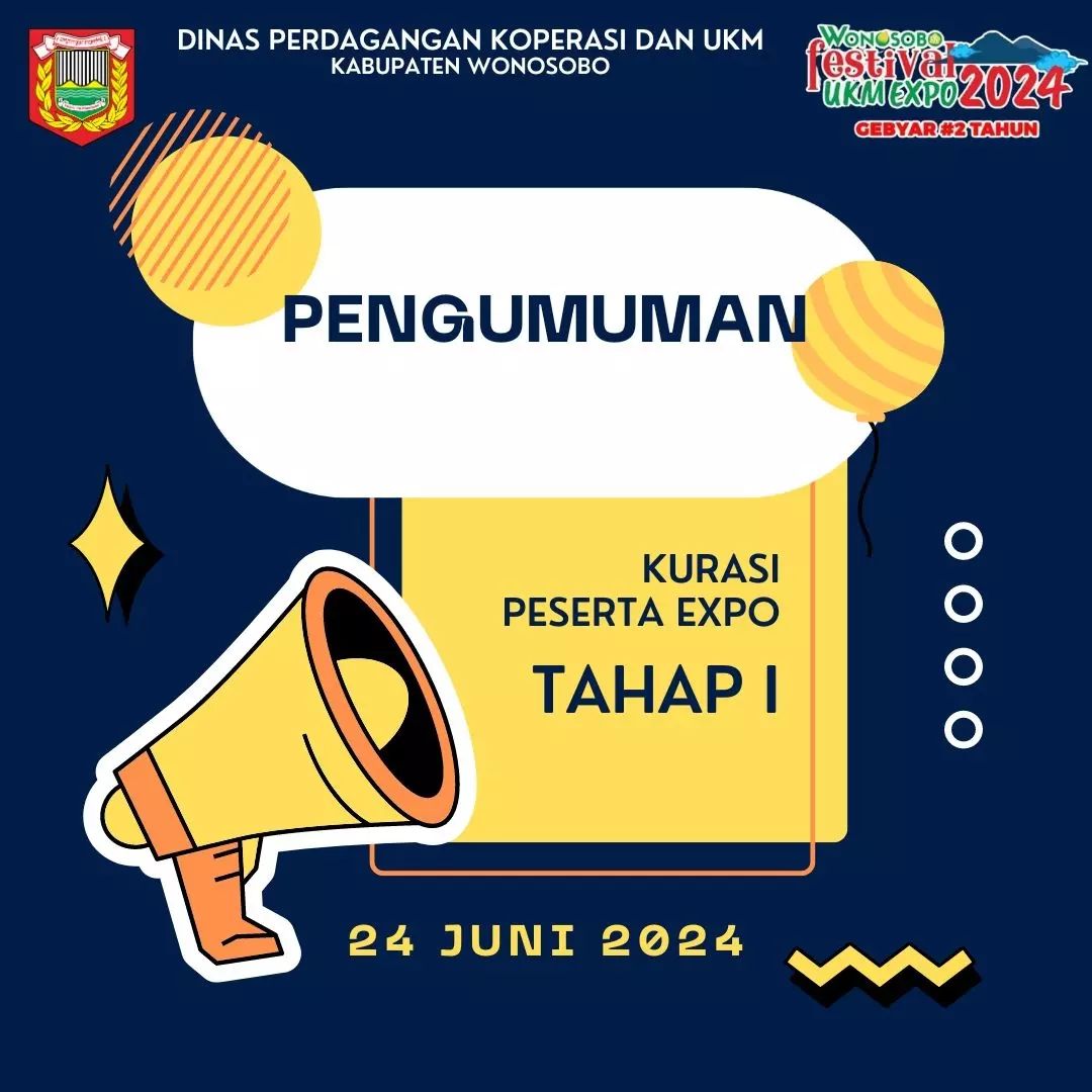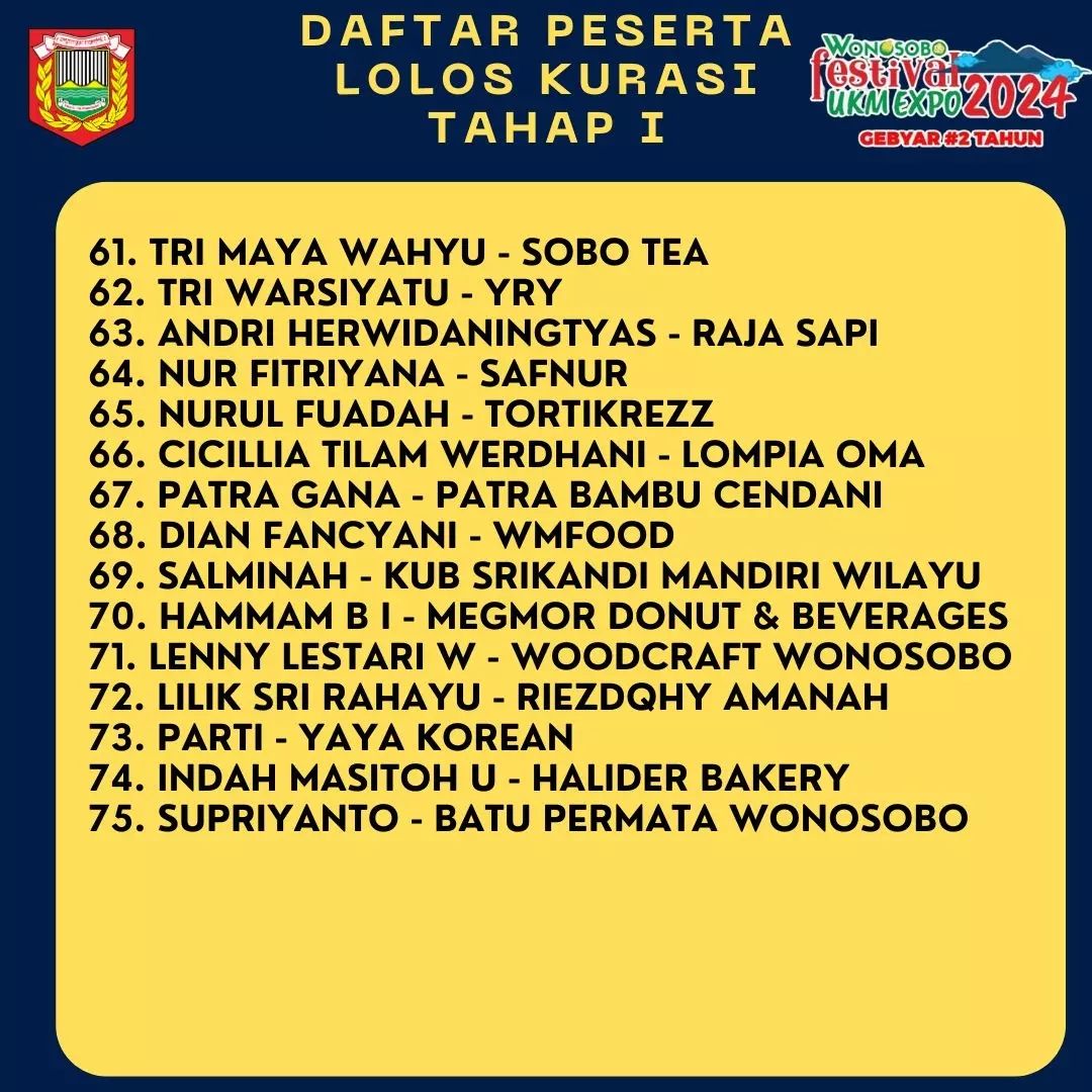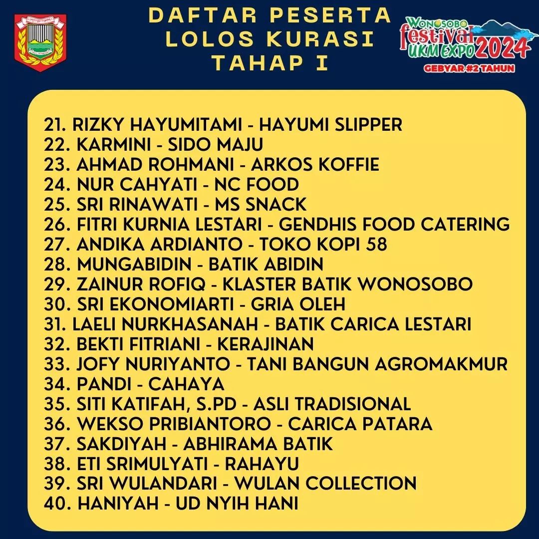 Berikut kami sampaikan daftar pelaku UKM yang lolos kurasi tahap 1 sebagai peserta "Wonosobo UKM Expo 2024". Bagi perserta yang dinyatakan lolos akan dihubungi oleh panitia untuk mengikuti kurasi tahap selanjutnya.